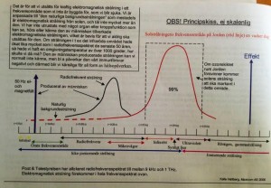 Den svarta kurvan till vänster på bilden är den strålning som finns inom det så kallade radiofrekvensspektret och den kurvan skulle inte ens ha funnits om inte människan hade skapat denna strålning. Detta utgör i stort sett all elektromagnetisk strålning som människan har skapat, som FM-radio, komradio, TV, GSM, analoga trådlösa telefoner, GPS, DECT, 3G, mikrovågsugnar, blåtandteknik, WiFi och mycket annat. Ni ser hur mycket högre effekten i detta frekvensspektrum nu har blivit på mindre än hundra år jämfört hur det har varit under alla de miljardtals år som livet har utvecklats. En sådan enorm förändring är såklart inte bra.
