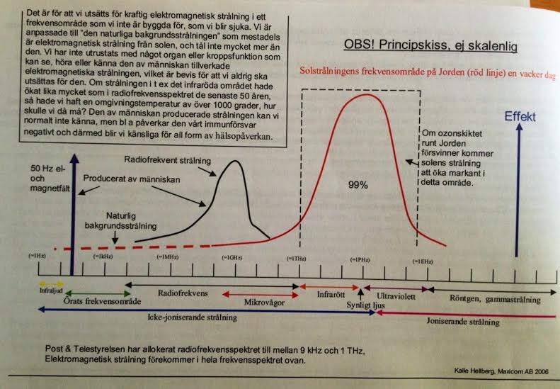 Vidare inser man att de argument som många försvarare av trådlös teknik kommer med, att den människoskapade strålningen är mycket svagare än solen, inte är ett hållbart argument, då det handlar om strålning i helt olika frekvensområden. Vi har utvecklats med de naturliga strålningskällorna, av vilka den viktigaste är solen, och alltså har vår kropp utvecklat ett skydd mot den typen av strålning, medan den människoskapade strålningen är helt ny för oss och därmed saknar vi skydd mot den. Att försöka påstå att den människoskapade strålningen är ofarlig för att solens strålning är mycket starkare är lite som att försöka påstå att en deciliter arsenik är ofarligt eftersom att en liter vatten är en mycket större volym, ett idiotiskt påstående eftersom arsenik och vatten är helt olika ämnen med olika biologisk effekt på levande varelser, precis som elektromagnetisk strålning i olika frekvensområden är helt olika varandra med olika biologisk effekt.