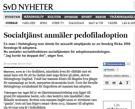 I november 2013 skrev svensk media om att Helsingborgs sociala myndigheter hade bedömt att det var tillåtet för en dömd pedofil att adoptera. Då händelsen till sist uppmärksammades av utomstående så anmälde myndigheten sig själv.