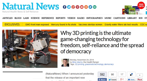 Mike Adams på Natural News skriver mycket bra om de revolutionerande förändringarna för frihet, självständighet och demokrati som 3D-printning kommer att medföra de kommande åren i artikeln Why 3D printing is the ultimate game-changing technology for freedom, self-reliance and the spread of democracy.