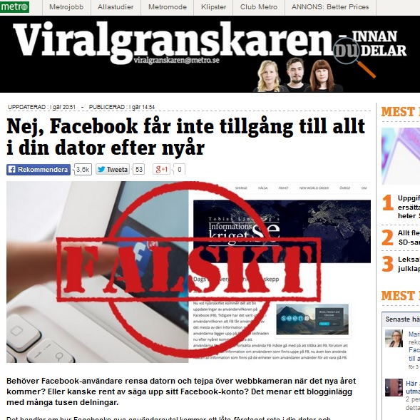 Igår (den 30/12) publicerade Metro en artikel där den sk. Viralgranskaren granskade de två första texterna jag hade skrivit om Facebooks nya användarvillkor. Samtidigt som det är tillfredsställande att det man skriver får stor uppmärksamhet, tydligen så hade mina två första texter haft över 13.000 interaktioner på Facebook fram tills när Metro-artikeln skrevs, så är det också tråkigt att Viralgranskarna bara valde att fokusera på endast ett citat som jag hade lyft in i min text från en annan Facebookanvändare och i övrigt helt hoppade över själva kärnfrågan av det mina handlade om, att de nya användarvillkoren tillsammans med den nya datapolicyn som också blir bindande ger Facebook en närmast obegränsad rätt att samla in och använda information från användarnas datorer, telefoner och andra enheter.