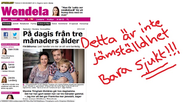 Enligt Wendela och många av de människor som idag tror att de ideal de står för är vägen till ett bättre och mer jämställt samhälle, så är allt som gör det exakt milimeter-rättvist mellan män och kvinnor som grupp, allt som bäst suddar ut det faktum att mänskligheten faktiskt består av två kön med lite olika fördelning av förmågorna när det kommer till just reproduktionen, alltid det bästa, även om det skulle råka gå ut över barnens behov av trygghet och anknytning. Det som helt uppenbart inte är av intresse för Wendela är att sprida den mer humana synen, som jag och många andra står för, att samhällets mål, om nu samhället ens ska lägga sig i detta, hellre borde vara att prioritera barnens behov först och att sedan, när detta primära intresse är tillgodosett, om det skulle behövas för att de individuella föräldrarnas intressen råkar kollidera med varandra, så gott det går försöka uppfylla båda dessa föräldrarnas unika önskningar i vad som måste bli en jämställd kompromiss dessa två föräldrarna emellan.