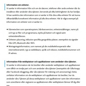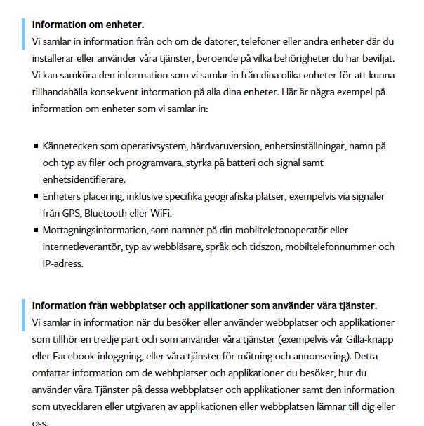 facebook-anvandarvillkor-001Det andra är att man kan läsa om Facebooks nya användarvillkor på denna länk och se texten på bilden jag har lagt upp här intill. Som ni ser så framgår det tydligt i texten under rubriken “Information om enheter” att FB kommer att samla in information från och om de enheter man använder för att vara på FB.