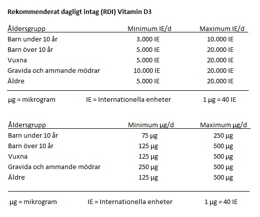 När solen står tillräckligt högt på himlen så bildas D-vitamin i huden när solstrålarna träffar den. Bara 15-30 minuter i solen per dag, mitt på dagen, ungefär mellan kl. 11-15, under perioden maj-augusti, ger tillräckligt med D-vitamin för ett par tre dagar. Resten av året är det viktigt att få i sig tillräckligt med D-vitamin via kost och tillskott eftersom solen om den står för lågt på himlen inte stimulerar bildning av D-vitamin. Tillskott av D-vitamin är tyvärr ett måste eftersom kroppens behov är mycket större än vad som går att få i sig via kosten och mycket större än statens rekommenderade dagliga intag (RDI). Statens rekommendation på 400 Internationella enheter (IE) för barn och vuxna och 800 IE för äldre människor och människor med begränsad solexponering [1] skyddar bara mot rena bristsymptom, för att kroppen ska fungera optimalt och för att hälsan bli så stor som möjligt så krävs så mycket att man kommer i närheten av de 10.000 IE eller mer som kroppen bildar när man är i solen mitt på dagen under sommaren. Detta innebär att barn under 10 år bör ta tillskott som ger 3.000-10.000 IE per dag, barn över 10 år, vuxna och äldre bör ta 5.000-20-000 IE per dag och gravida och ammande mödrar bör ta 10.000-20.000 IE per dag [2]. Se tabell nedan. Generellt bör man ta närmare de lägre värdena i varje kategori ju yngre man är och ju mindre man väger och närmare de högre värdena ju äldre man är och ju mer man väger. När man talar om tillskott av D-vitamin så är det alltid D3-vitamin som avses, den form av D-vitamin som djur bildar, eftersom den formen har mycket större biotillgänglighet än det D-vitamin som finns i växter som är av formen D2-vitamin.
