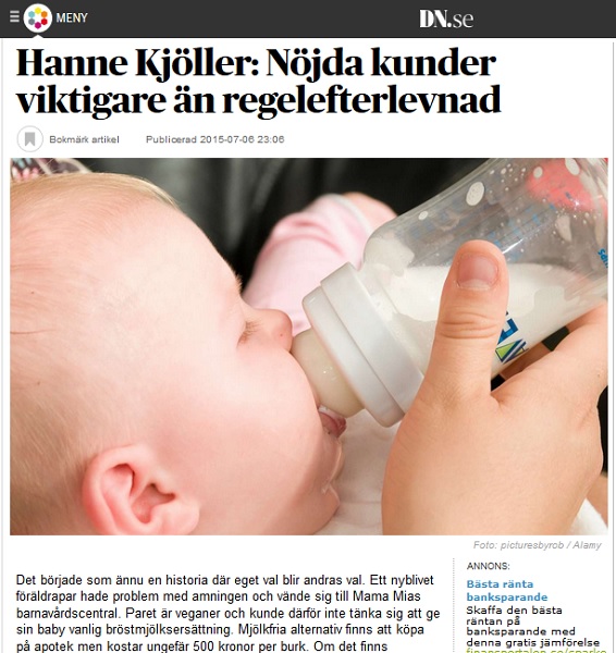 Här kunde hela denna konstiga historia ha slutat, men tyvärr så gick veganparet istället till den privata barnavårdscentralen Mamma Mia i Stockholm och fick recept på specialersättningen där. Mamma Mia verkar se det som att de som går till deras klinik är kunder vars krav ska uppfyllas på bästa sätt så att vinster genereras till kliniken på skattekollektivets bekostnad.