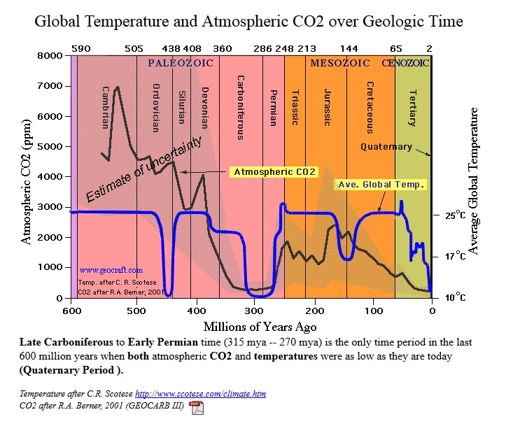 Faktum är att CO2-koncentrationen i genomsnitt under de senaste 300 miljoner åren har legat på 1200 ppm och till och med i snitt över 2000 ppm de 300 miljoner åren innan det, detta helt utan att det har samspelat med temperaturen, vilken bevisas av att temperaturen har varit både låg och hög vid tillfällen då CO2-koncentrationerna har varit både låga och höga. Detta illustreras i bilden här nedanför och när man har insett detta så förstår man att det inte ligger så mycket bakom teorierna som förs fram som “sanningar” av IPCC. [7]