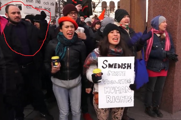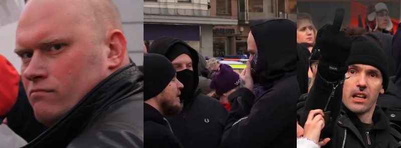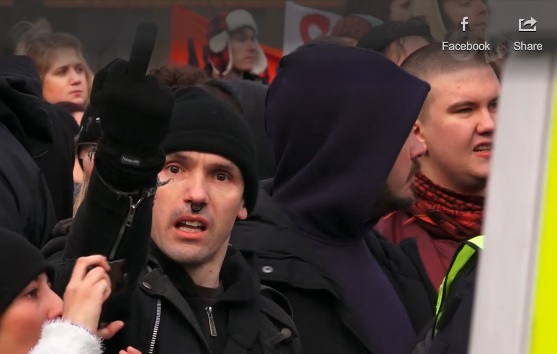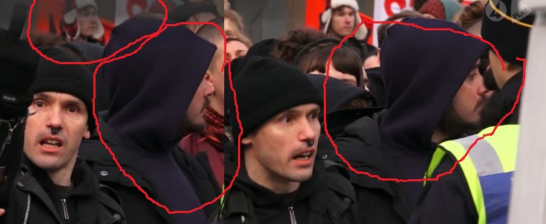 Titta noga på flaggorna/banderollerna i bakgrunden bakom mannen med näsringen! Det är vänsterflaggor/banderoller. Titta sedan noga på mannen till höger om mannen med näsringen, han som bär en blå munkjacka med huvan uppfälld och en svart jacka över det och har ett noggrant rakat skägg där skägg och mustasch är tydligt avskilda med ett mellanrum. Jag har ringat in flaggorna och mannen med den blå munkjackan på bilderna här under.