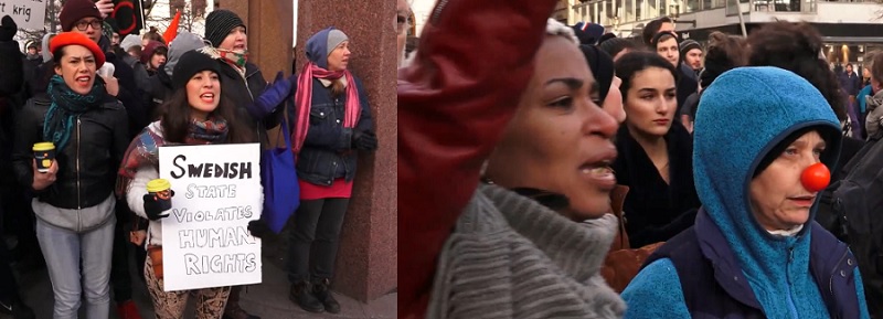 Vänstertjejen med skylten syns i nedre vänstra hörnet på en av bilderna också med fjanten med näsringen. Där har hon tagit av sig vanten för att fota, men samma mössa och vita luddiga tröja. De har använt vänsterpack på bilderna för att få med fula dräggiga människor när de pratar om “främlingsfientliga”… psykologi, mörkläggning och propaganda.