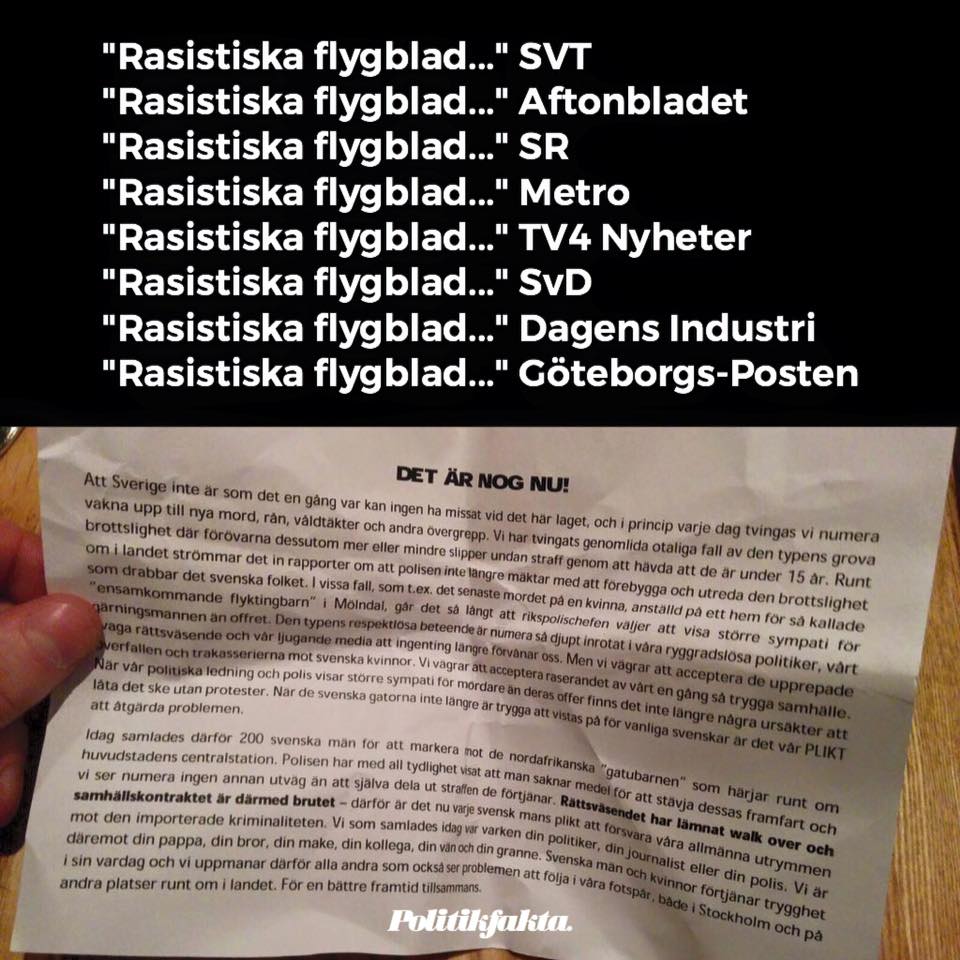 På bilden till höger kan ni se det omtalade flygbladet som delades ut av maskerade individer vid Sergels torg den 29 januari 2016 och som av de flesta svenska medier beskrivs som rasistiskt och dåligt. Vidare hävdar de flesta medier att flygbladet delades ut av eller hade något att göra med vad de flesta medier påstår ha varit ett medborgargarde som ska ha dragit runt på stan och misshandlat människor med utländskt utseende.