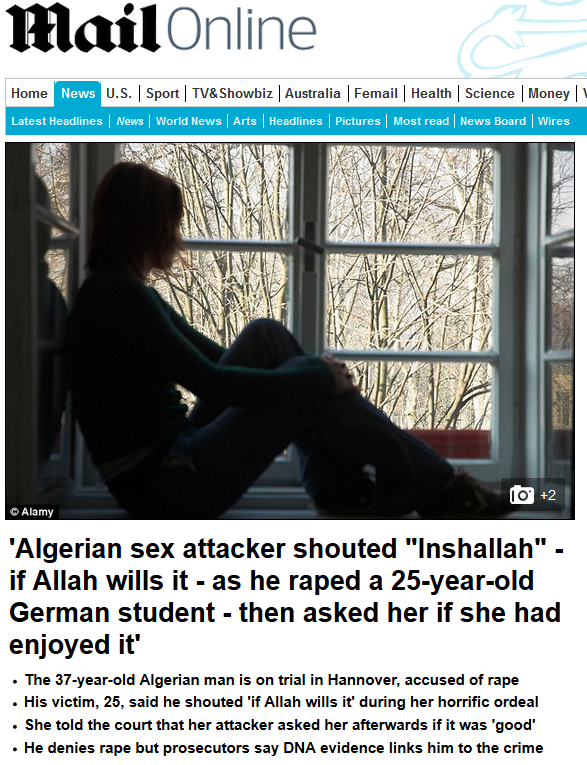 En artikel i Daily Mail beskriver den brutala våldtäkten som inträffade när den 25-åriga tyska flickan kl. 05 på morgonen var på väg hem från en nattklubb i Hannover. En 37-årig algerisk man kom fram och frågade henne om klockan, men innan hon han att svara grep han tag i hennes arm och drog in henne i en gränd.