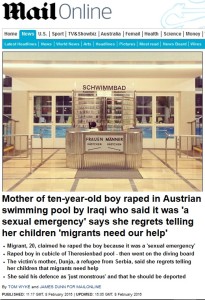 En artikel i Daily Mail berättar om hur en irakiskt migrant som våldtog en tioårig pojke på ett badhus i Österrike förklarade det hela med att det var en “sexuell nödsituation” eftersom han inte hade haft sex på fyra månader. Våldtäkten hade varit så brutal att pojken efteråt fick vårdas på sjukhus för sina allvarliga fysiska skador. Gärningsmannen var en 20-årig irakisk migrant.