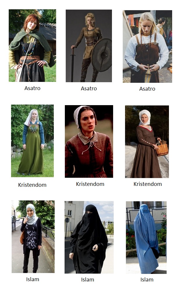 kvinnor-asatro-kristendom-islam-001I det nordliga Europa hade fria kvinnor tidigare kunnat gå fritt, visa sin skönhet, skilja sig om äktenskapet inte passade, styra över både mark och gård lika gärna som männen samt till och med vara sköldmö om talang och vilja fanns. Allt detta trots att ingen någonsin trodde att kvinnor och män var exakt lika varandra. Med kristendomens intåg förändrades detta till mer av att kvinnor skulle täcka sig, av att de var underställd mannen och av bestämmelser att de saknade arvsrätt. I det Europa där synen på samhällets ledare var att de innehade ett slags ämbete med mycket makt så länge som de skötte det väl och hade folkets stöd, en slags naturlig och frivillig hierarki, så infördes med kristendomen idén om “Dei gratia“, av guds nåde, det vill säga att ledarna eller kungarna fick sin rätt att härska, inte från folket, utan från gud. Dessa och andra egenheter med den inkräktande Mellanösternreligionen var främmande för de europeiska folken och alla försök att införa kristendomen via folket misslyckades. Bara genom att gå via mäktiga ledare som som såg personliga fördelar för sig själva och sina familjer med den nya mer hierarkiska religionen kunde kristendomen ta sig in i Europa steg för steg och ofta med enormt tvång och stor blodspillan eftersom folket ofta kämpade emot.