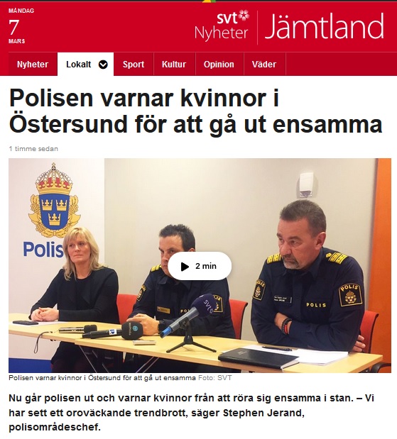 I det nya trevliga mångkulturella Sverige så tvingas polisen i Östersund gå ut med en varning om att kvinnor nu mera inte ska röra sig själva ute i centrala Östersund sena kvällar och nätter.