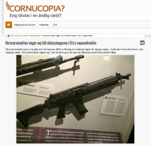 Bloggen Cornucopia skriver om att den svenska försvarsmakten har sagt nej till EU:s förslag på skärpta vapenlagar eftersom de anser att flera av begränsningarna som EU vill införa på legala vapenägare kommer att påverka den svenska försvarsförmågan negativt.
