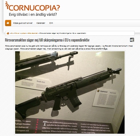 sjalvforsvar-cornucopia-forsvarsmakten-002Bloggen Cornucopia skriver om att den svenska försvarsmakten har sagt nej till EU:s förslag på skärpta vapenlagar eftersom de anser att flera av begränsningarna som EU vill införa på legala vapenägare kommer att påverka den svenska försvarsförmågan negativt.