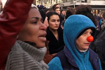 Här på denna bild an man se Tess Asplund stå bredvid den antirasist som spottade mannen som stod bredvid mig i ansiktet och sedan försökte spotta mig i ansiktet. Antirasisten som spottade är alltså den lite äldre kvinnan på bilden som är iklädd en röd clownnäsa. När hon spottade mannen i ansiktet och försökte spotta på mig hade hon tagit av sig både clownnäsan och den blå huvjackan, istället hade hon någon slags beige eller vit polotröja eller något liknande på sig, vilken man kan ana under den blå huvjackan på bilden.