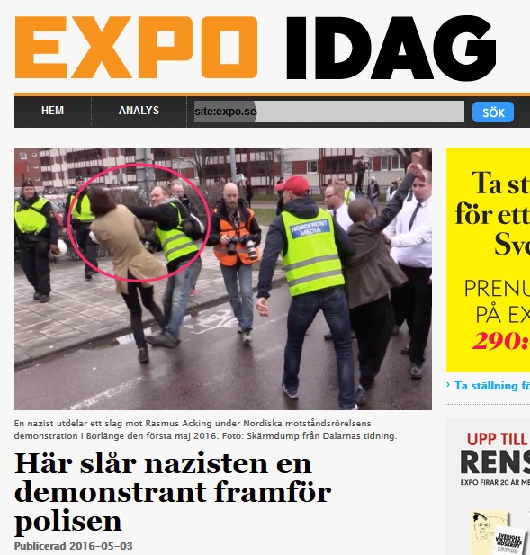 Samma dag som Expo gick ut med bilden av Tess Asplund stående med knuten näve framför Nordiska Motståndsrörelsen så publicerade de även artikeln om att en aktivist från Nordiska Motståndsrörelsen skulle ha slagit en motdemonstrant. Motdemonstranten heter Rasmus Acking och i Expo:s artikel så påstår han att han blev puttad och slagen i ansiktet. Överst i artikeln finns denna bild där det ser ut som att en aktivist från Nordiska Motståndsrörelsen slår en annan man i ansiktet.