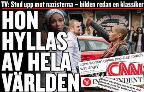 De flesta lär ha sett den vid det här laget, bilden av Tess Asplund som med knuten näve står framför Nordiska Motståndsrörelsens demonstrationståg i Borlänge som de senaste dagarna har visats i nästan samtliga svenska medier och de flesta större internationella medier. Hon beskriver det själv som att allt var helt spontant, fotografen som tog bilden säger att han plötsligt bara såg henne stå där mitt i demonstrationsvägen och i en intervju på Aftonbladet TV sa de båda att det var första gången de träffade varandra. Sist jag såg Tess Asplund, för bara lite drygt tre månader sedan, så stod hon och ljög i en intervju på Aftonbladet TV om att hennes sällskap helt oprovocerat hade blivit överfallna av fascister efter Folkets demonstrations möte på Norrmalmstorg och fotografen som tog bilden på Tess Asplund bara råkar vara anställd på Expo, en organisation som har gjort sig känd för att överdriva, förvränga och ljuga, som t.ex när de samma dag som de offentliggjorde bilden av Tess Asplund hävdade att en man hade blivit slagen av en aktivist från Nordiska Motståndsrörelsen, även fast det inte alls handlade om ett slag, utan bara en knuff, vilket framgår tydligt om man ser filmklippen av situationen.