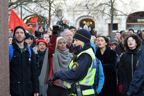 Här är en annan bild från Nya tiders bildextra från Folkets demonstration där man kan se att Tess Asplund står bredvid antirasisten som spottade. På bilden är den spottande antirasisten delvis dold bakom en polis. Bredvid Tess Asplund kan man sedan se hennes långa manliga vän som också är med och hittar på i intervjun med Aftonbladet TV.