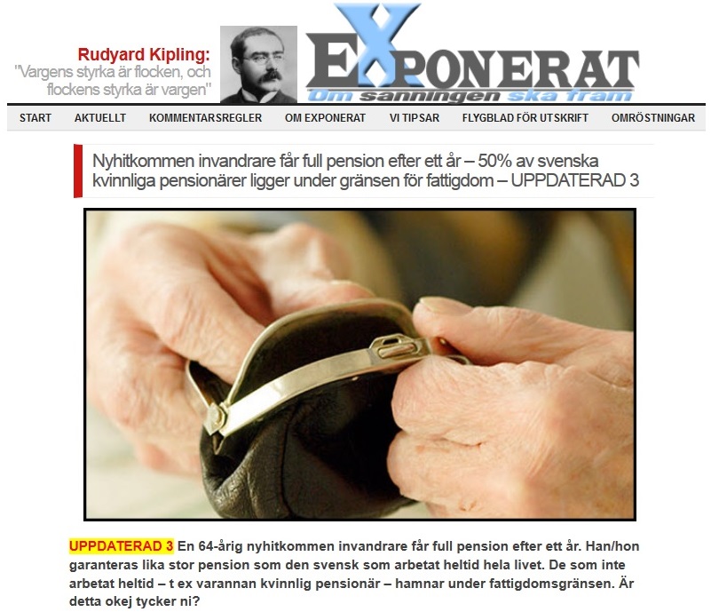 Nyhitkomna invandrare får full pension bara ett år efter att de har kommit till Sverige, lika mycket som svenskar som har arbetat här och bidragit till vårt samhälle i hela sitt liv och ofta till och med mer än de som har arbetat halvtid under livet för att t.ex ta hand om barn och hem. Detta förklaras i en läsvärd och omfattande text av Exponerat som är ordentligt understödd av fakta. Många sidor på nätet, däribland pensionsmyndigheten, påstår att Exponerats uppgifter inte stämmer, men pensionsmyndigheten och de andra sidorna förvränger bara vad som gäller, vårt system är verkligen så tokigt orättvist som Exponerat skriver.