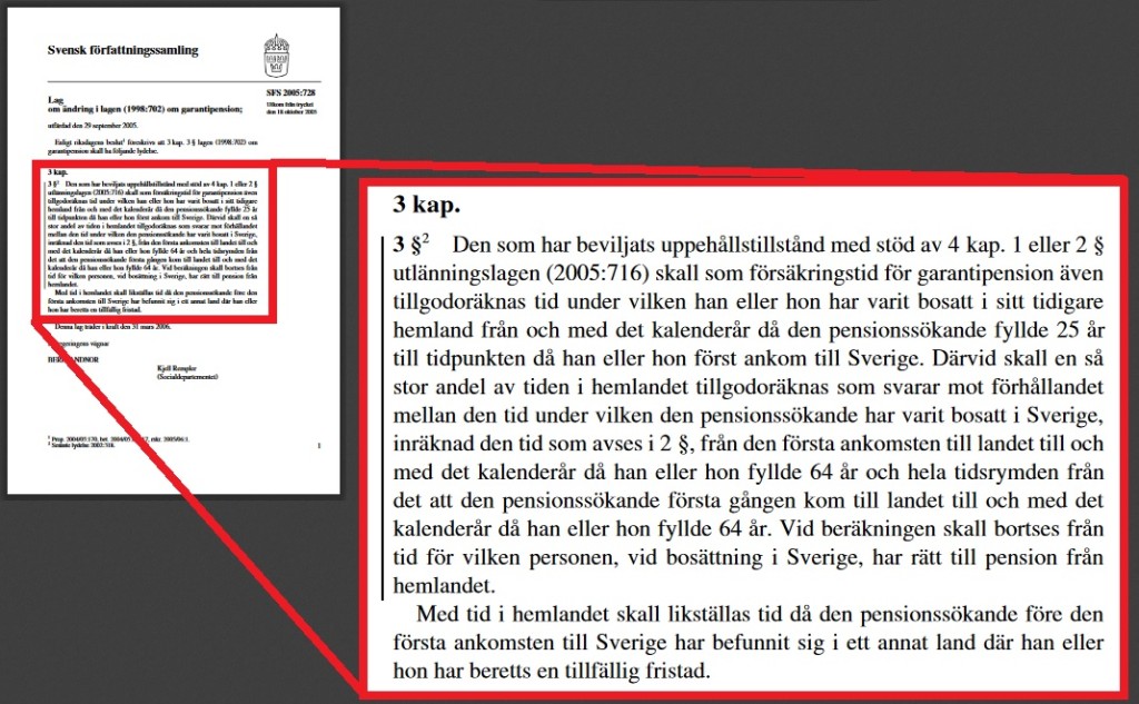 Vad alla dessa sidor missar eller med viljes inte nämner är att det finns något som heter lag SFS 2005:728, vilket Exponerat nämner precis under den andra uppdateringen i sin text, som säger att som försäkringstid för garantipension skall även tid i hemlandet räknas in för de som får uppehållstillstånd som flyktingar och alternativt skyddsbehövande och som alla vet så är nästan alla som kommer till Sverige människor som söker asyl och som får uppehållstillstånd på dessa grunder.