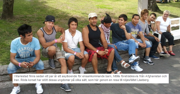 En av många idag klassiska bilder som på ett bra sätt illustrerar det vansinne som nu råder i Sverige, då myndigheter godtar vuxna människors uppenbara lögner om sin ålder och registrerar dem som barn, är denna bild från Röda korset i Mariestad, samma organisation som på ett lokalt nationaldagsfirande förklarade att den närvarande publiken och alla andra svenskar är bortskämda som inte tar emot fler asylsökande än vad vi gjorde förra året.
