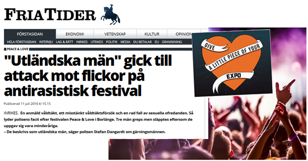 utlandska-man-gick-till-attack-mot-flickor-pa-antirasistisk-festival-001Japp, även vid Peace & Love-festivalen i Borlänge är det alltså utländska män som har begått de sexuella övergreppen och flera av övergreppen har varit Taharrush-liknande och alltså skett genom att en klunga av äckliga jävlar har omringat en tjej och tafsar på henne eller ännu värre.