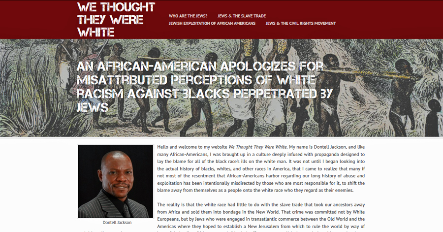Dontell Jackson, en svart amerikan, driver en väldigt intressant sida som heter “We Thought They Were White” där han helt korrekt beskriver att det framförallt var judar som organiserade slavhandeln med svarta samt var ägarna av svarta slavar i Amerika och att de sedan genom medveten propaganda och historieförfalskning lagt skulden för allt detta ohyggliga på de vita européerna för att få svarta och andra att rikta sin ilska mot dem istället för mot judarna.