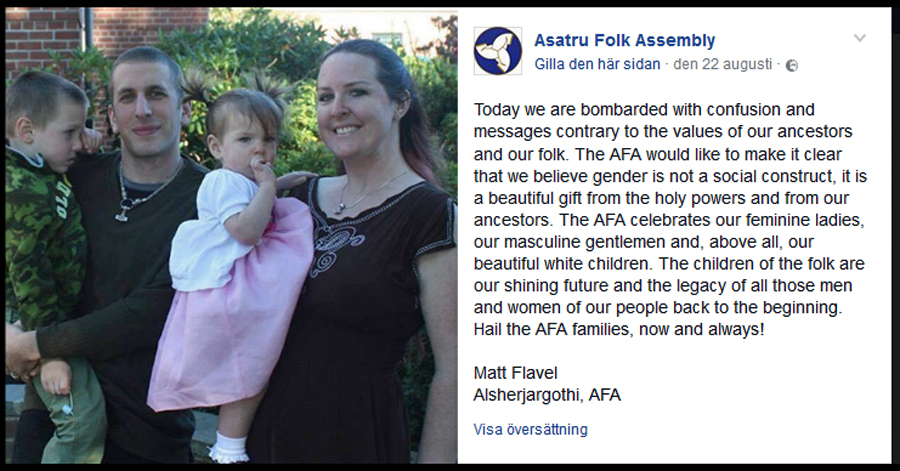 Den 22 augusti skrev Matt Flavel, en av ledarna för den amerikanska “Asatru Folk Assembly” (AFA) att vi i dagens värld dagligen utsätts för budskap som går emot våra förfäders och vårt folks värderingar och att AFA därför vill förtydliga att organisationen inte tror att kön är en social konstruktion, utan att det är en vacker gåva från gudarna och från våra förfäder och att AFA tvärtom värdesätter våra feminina kvinnor, maskulina män och, över allt annat, våra vackra vita barn. Sedan avslutade han med att poängtera att vårt folks barn som är vår lysande framtid och att de också är vårt arv från våra förfäderna sedan tidernas begynnelse.