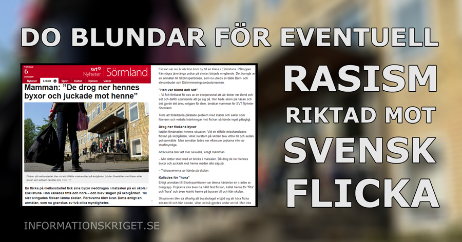 I SVT-artikeln nämns att Diskrimineringsombudsmannen (DO) “ska ska utreda de delar som handlar om att flickan ska ha utsatts för kränkningar kopplade till sitt kön.” Det låter bra och bör utredas, men samtidigt så är det väldigt symptomatiskt för Sverige att bara detta tas upp, trots att det var väldigt tydligt i detta fall att det troligtvis inte bara handlade om att hon var tjej, utan att hon också var en blond svensk tjej som hade “skinn på näsan” och sa ifrån vilket alla i det nya Sverige inte gillar.