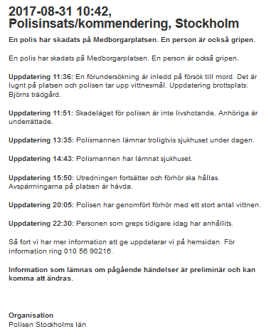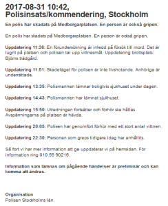 I Aftonbladets uppdaterade artikel om gårdagens händelse rapporteras det nämligen om att Åklagarmyndigheten uppger att den gripne gärningsmannen är 17 år, medan ett kvinnligt vittne som hade sett gärningsmannen bli bortsläpad av polisern uttalade sig längre ned i artikeln och beskriver gärningsmannen som varandes i 30-årsåldern. [Arkivlänk]