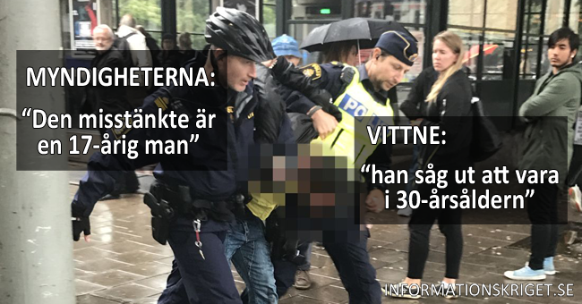 Sverige har ett allvarligt åldersproblem då myndigheterna meddelar att gärningsmannen i gårdagens knivattack mot polisen är 17 år, medan vittnen beskriver honom som 30 år.