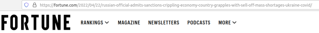 Den amerikanska tidningen Fortune skrev en artikel den 22 april med en rubrik som sa att “ryska tjänstemän erkände att sanktionerna förlamar ekonomin medan landet kämpar med utförsäljning och utbredd brist” och sedan avslutades artikeln med slutsatsen att det kommer att bli mycket värre för Ryssland då ryska företag inte ens har börjat känna av effekterna än.