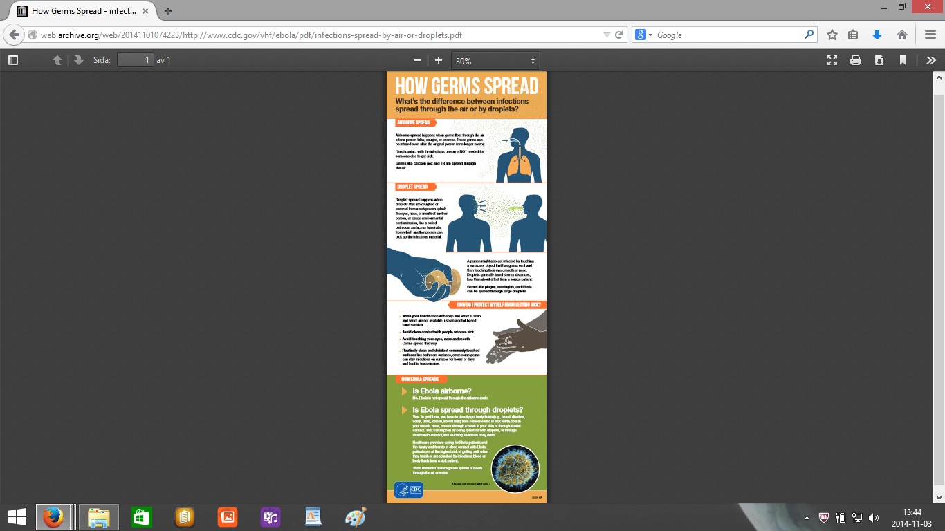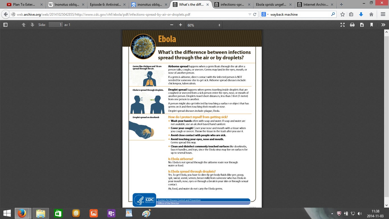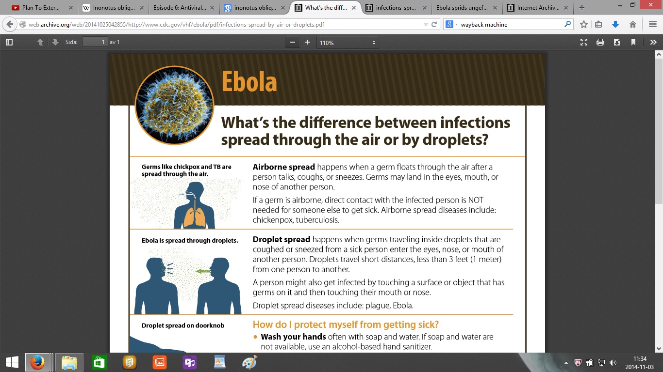Här är bilderna av den första versionen av PDF:en från den 25 oktober med informationen att ebola sprids med droppar 1 meter genom luften kan ni se här: