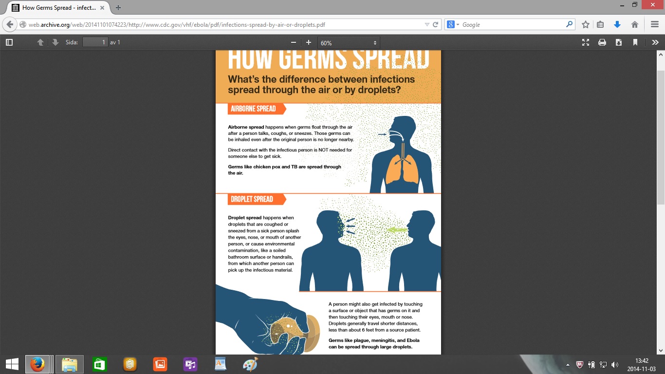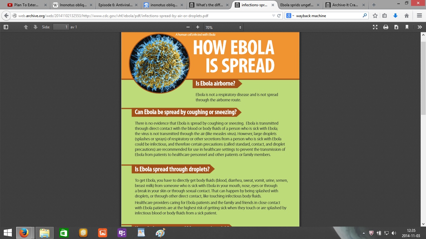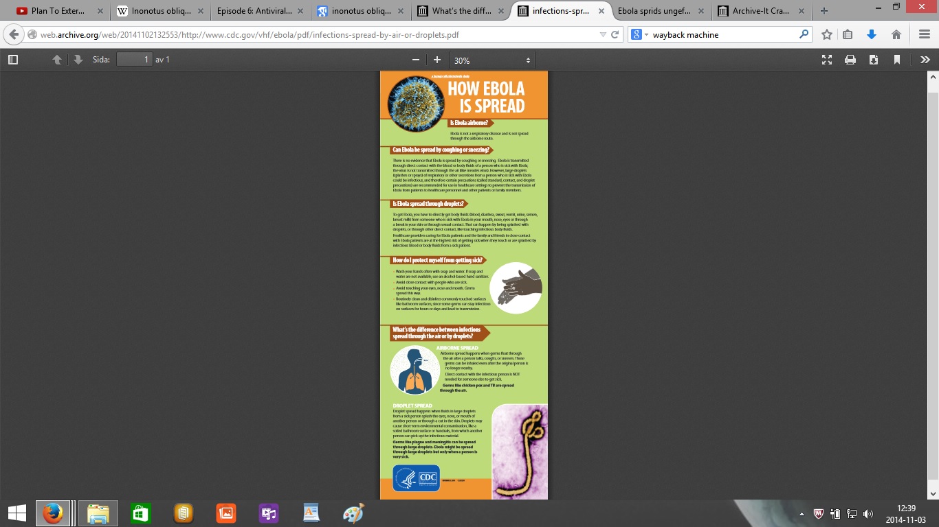 Här är bilderna av den första versionen av PDF:en från den 25 oktober med informationen att ebola sprids med droppar 1 meter genom luften kan ni se här: