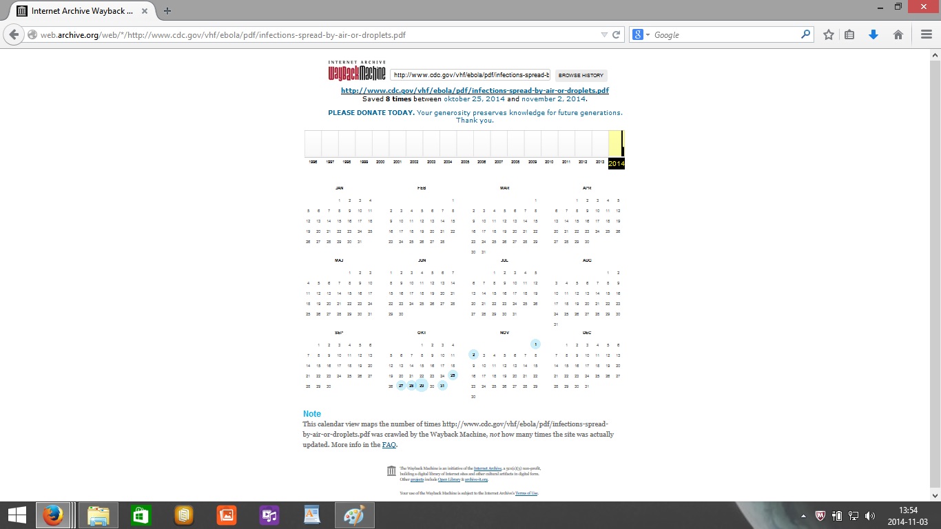 Hade det inte varit för att vissa personer regelbundet sparar ned information för den skull att myndigheter plötsligt bestämmer sig för att korrigera sanningen eller verktyg som webarkivet på The Wayback Machine så hade denna information om hur lätt ebola faktiskt sprids varit borta för alltid. Så tack för The Wayback Machine!